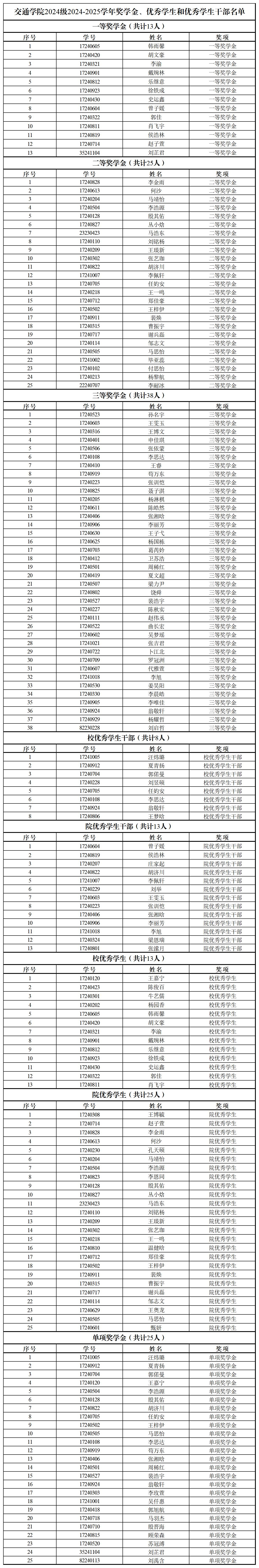 2024级2024-2025学年奖学金、优秀学生和优秀学生干部名单如下: